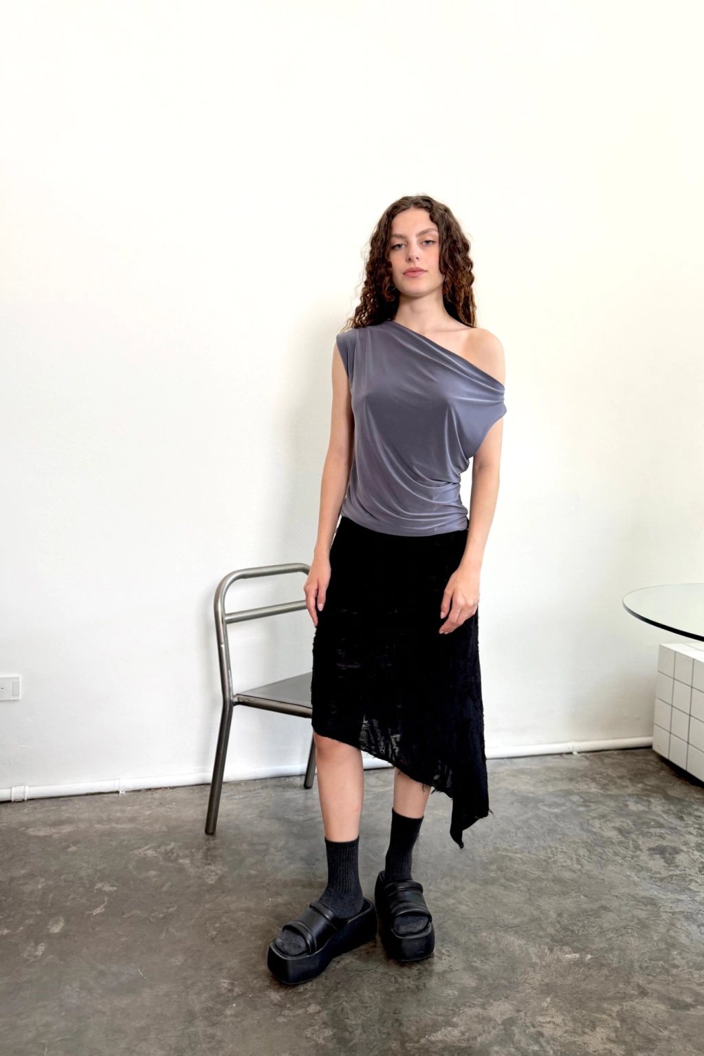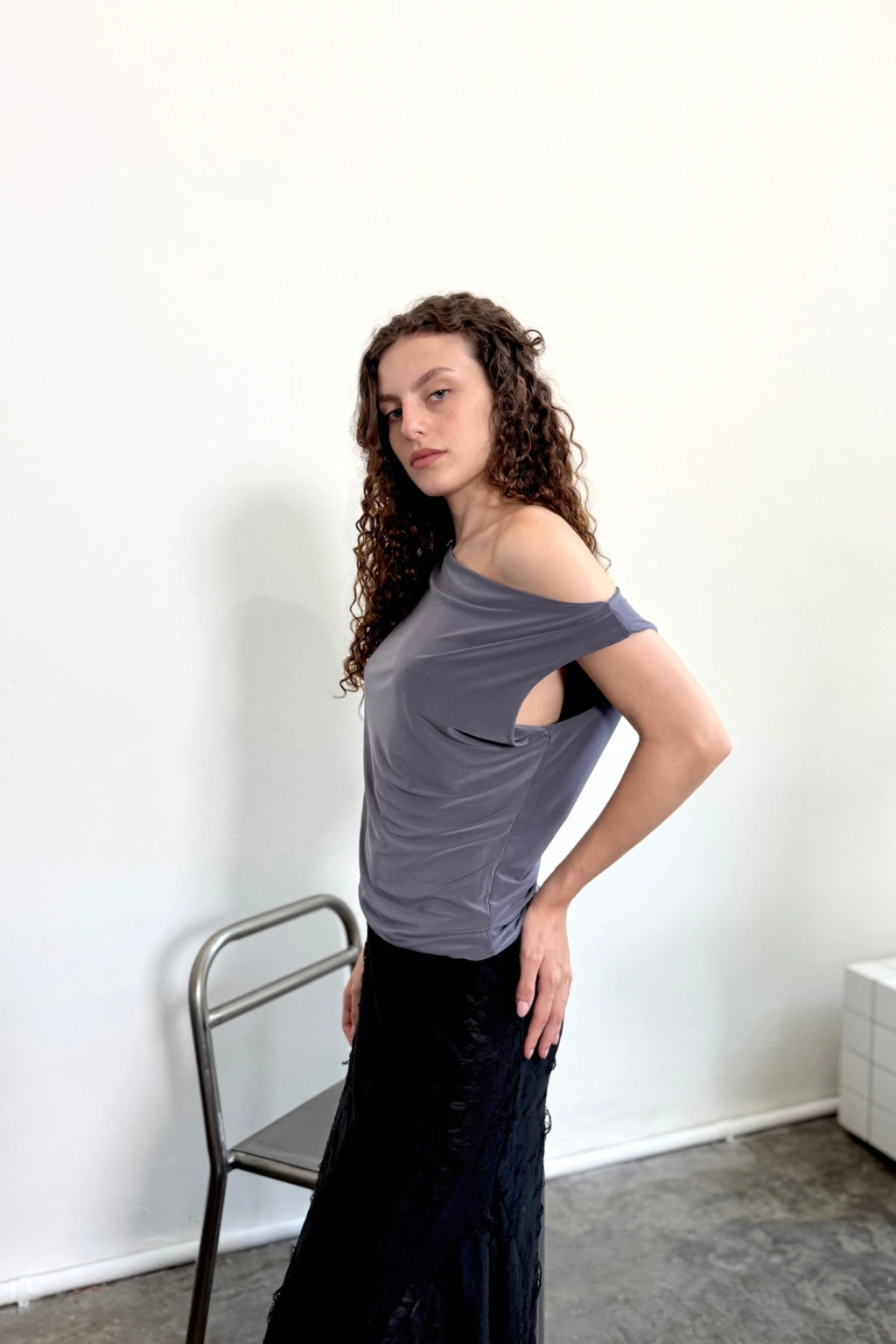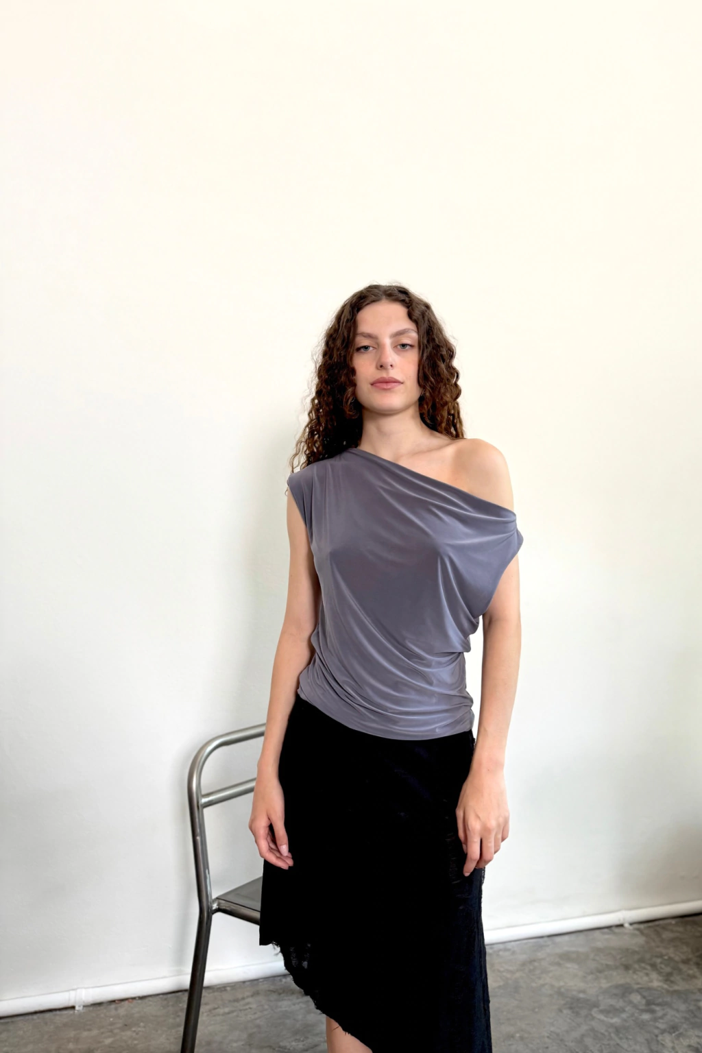 Remera asimétrica de microfibra elastizada, color gris topo, con interior embolsado, es decir doble tela; en delantero y espalda para más comodidad.